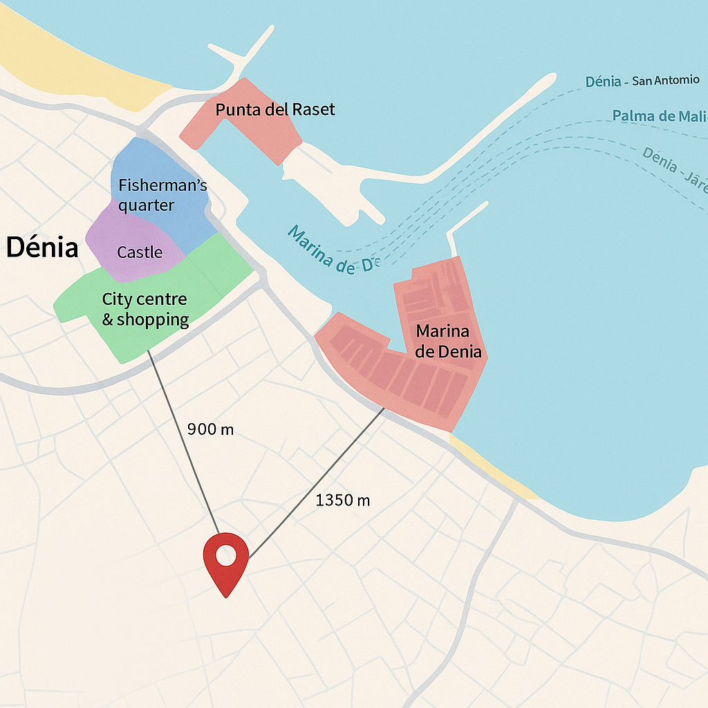 Binnen één minuut lopen vind je drie supermarkten, en op korte loopafstand liggen het strand van Dénia, het oude stadscentrum en de levendige haven met gezellige terrasjes en restaurants.